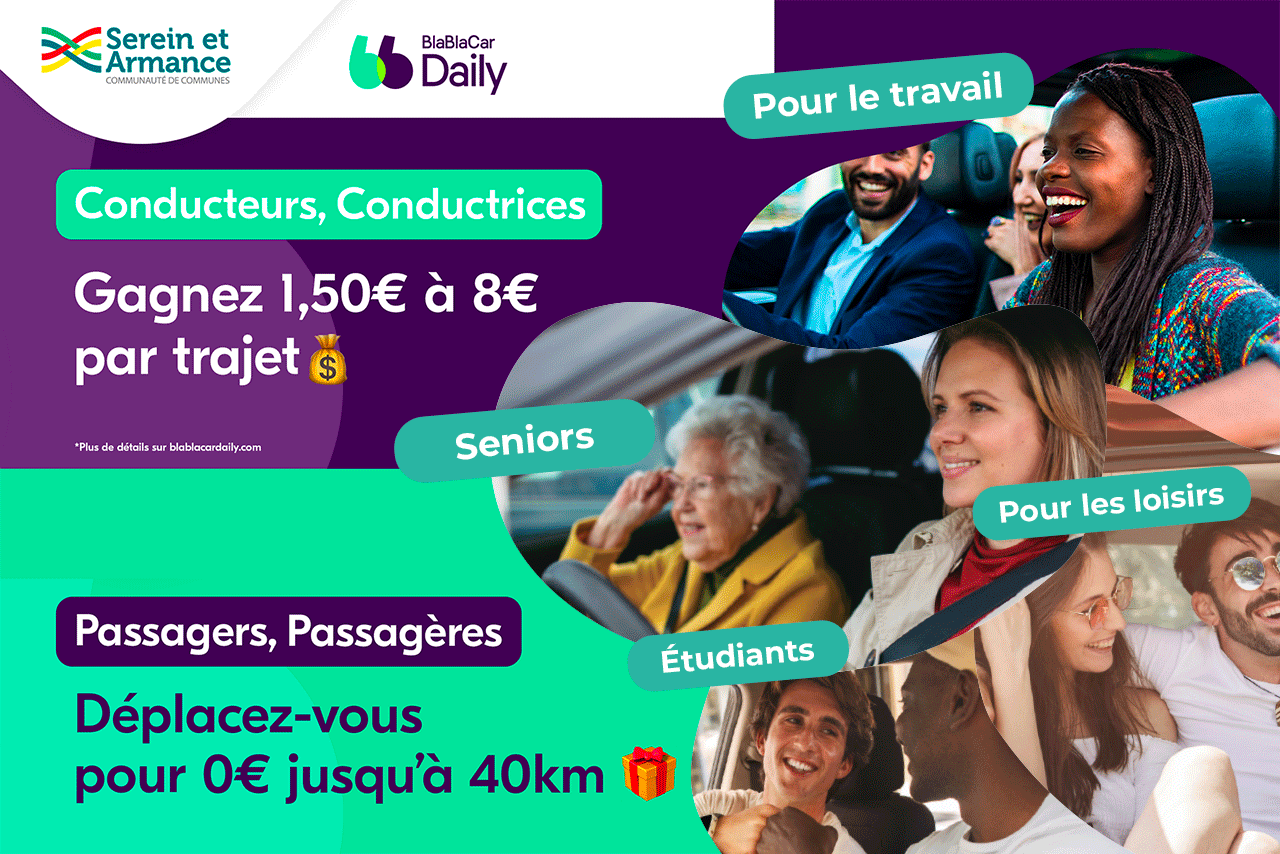 Depuis le 1er octobre, vous pouvez vous déplacer à moindre coût pour vos trajets domicile-travail en covoiturant ! Cette opération fait l’objet d’un partenariat de 12 mois entre la CCSA et BlaBlaCar Daily. Dans le cadre du financement des trajets, un budget de 5 000 € est alloué pour toute la durée de l’expérimentation (jusqu’au 30 septembre 2025). Ce dispositif a pour objectif de s’adapter aux horaires de travail, de développer des liaisons internes au sein de la Communauté de Communes, de réduire les émissions de gaz à effet de serre, d’être une alternative à l’autosolisme mais également d’aider financièrement les personnes souhaitant se déplacer sur le territoire.